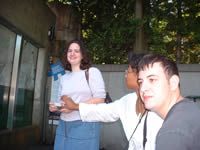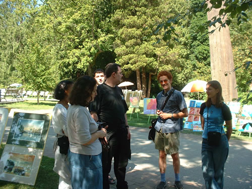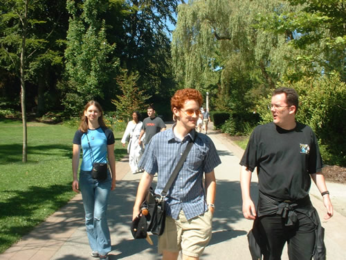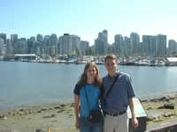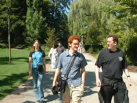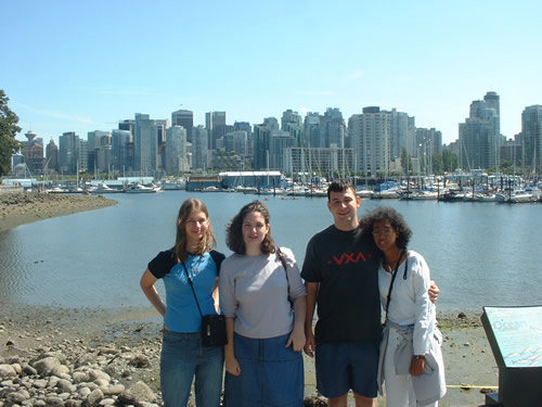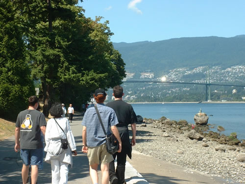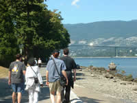 The crew walks along the seawall in Stanley Park; the Lion's Gate