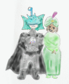What a surprise for Riker, though! In the hallway, he met a very strange man. After his subspace teleport so he could attend this special party, Anakin Skywalker was all burnt up and bleeding, and had lost his breath! Oh, he will never subspace teleport again! Riker dragged the poor man into sickbay, where whoever the doctor is fitted him into an old hallowe'en costume complete with breathing tubes and pressurized linings. Now even Anakin could attend the party!